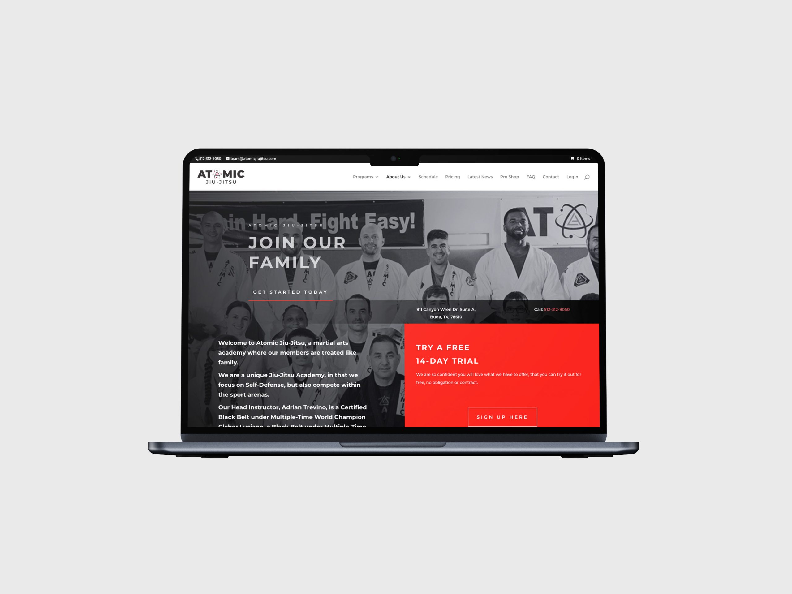 The website seamlessly integrates black and white visuals with vibrant, full-color images showcasing the influential Gracie Family. As pioneers who introduced Brazilian Jiu-Jitsu to the United States, the Gracies hold a special place in the history of the sport. Professor Adrian Trevino’s training under Master Cleber Luciano, a black belt under Royler Gracie, further establishes Atomic Jiu-Jitsu’s connection to this rich lineage. The website design reflects this history, creating an engaging and informative online presence.